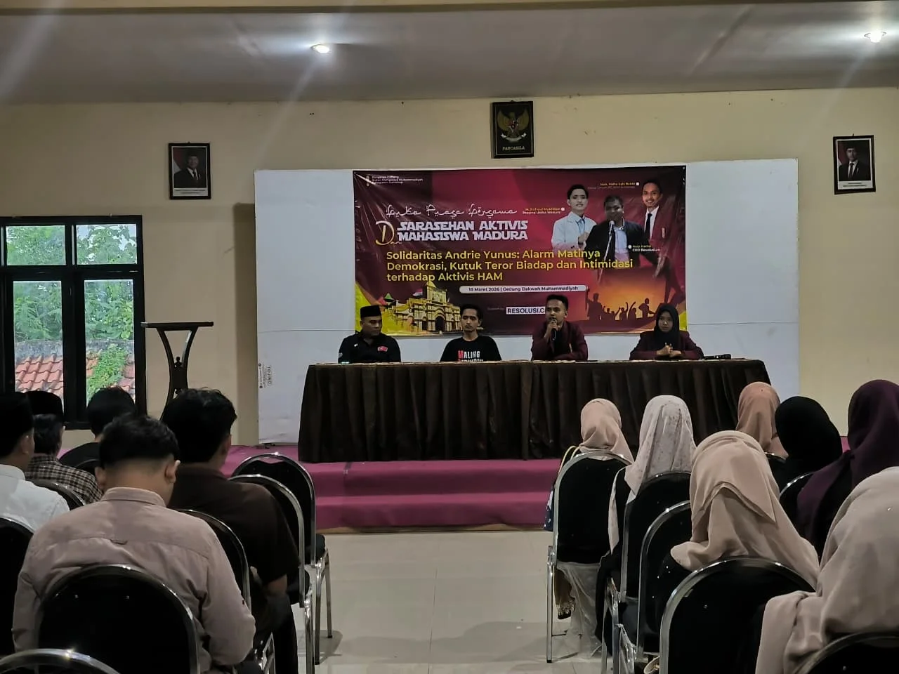 Keterangan foto : Puluhan aktivis PC Ikatan Mahasiswa Muhammadiyah (IMM) bersama aliansi Badan Eksekutif Mahasiswa (BEM) lintas kampus menggelar aksi solidaritas dan diskusi publik, Rabu (18/3/2026) Harianterbit.id SUMENEP – Gelombang kecaman terhadap penyiraman air keras pada aktivis Komisi untuk Orang Hilang dan Korban Tindak Kekerasan (KontraS) Andrie Yunus meluas ke Kabupaten Sumenep, Madura. Puluhan aktivis PC Ikatan Mahasiswa Muhammadiyah (IMM) bersama aliansi Badan Eksekutif Mahasiswa (BEM) lintas kampus menggelar aksi solidaritas dan diskusi publik bertajuk “Solidaritas Andrie Yunus: Alarm Matinya Demokrasi, Kutuk Teror Biadab dan Intimidasi terhadap Aktivis HAM” di Gedung Dakwah Muhammadiyah Sumenep, Rabu (18/3/2026).